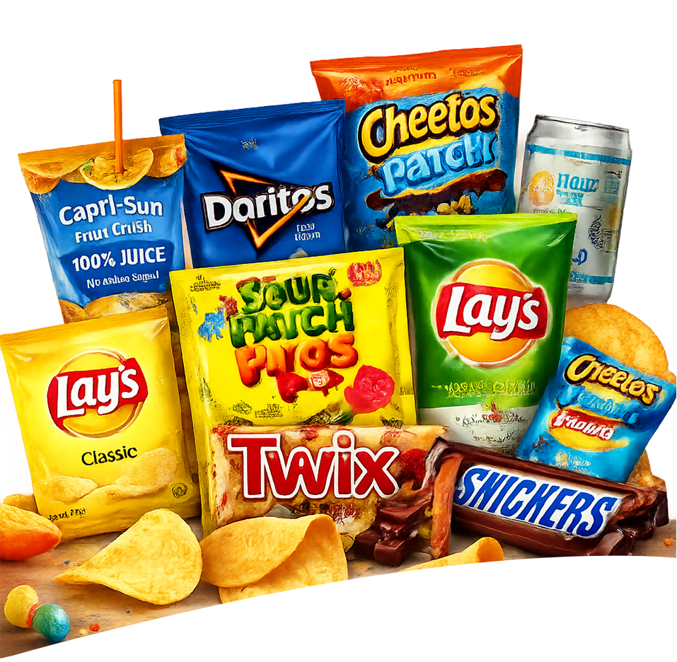 Explore our wide selection of delicious options, including crunchy snacks, irresistible candies, and refreshing beverages.